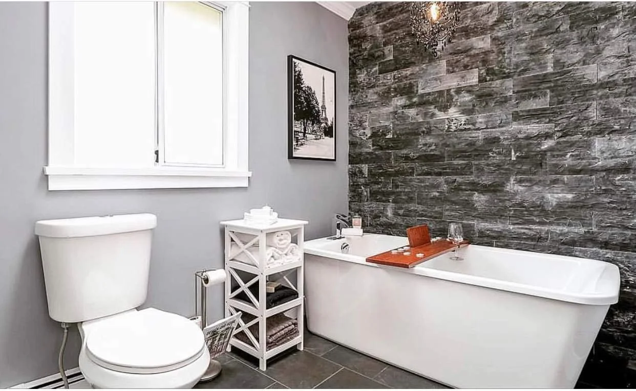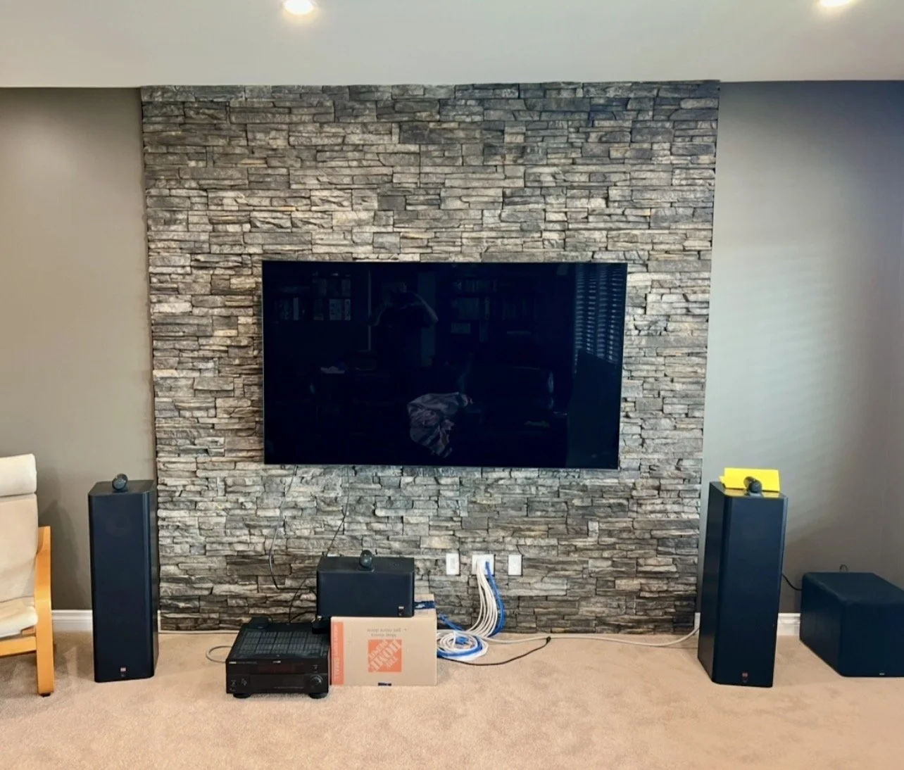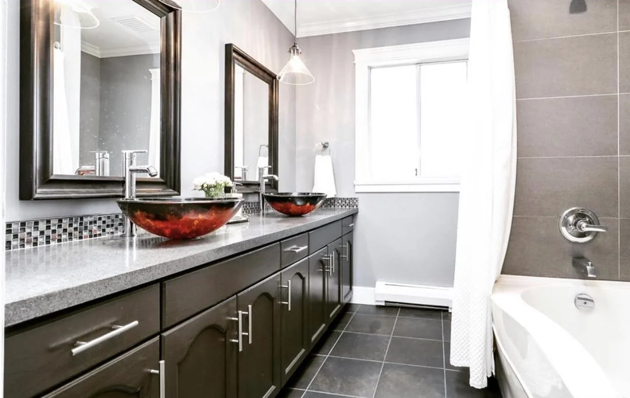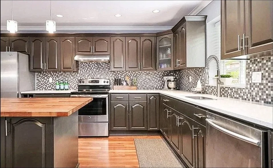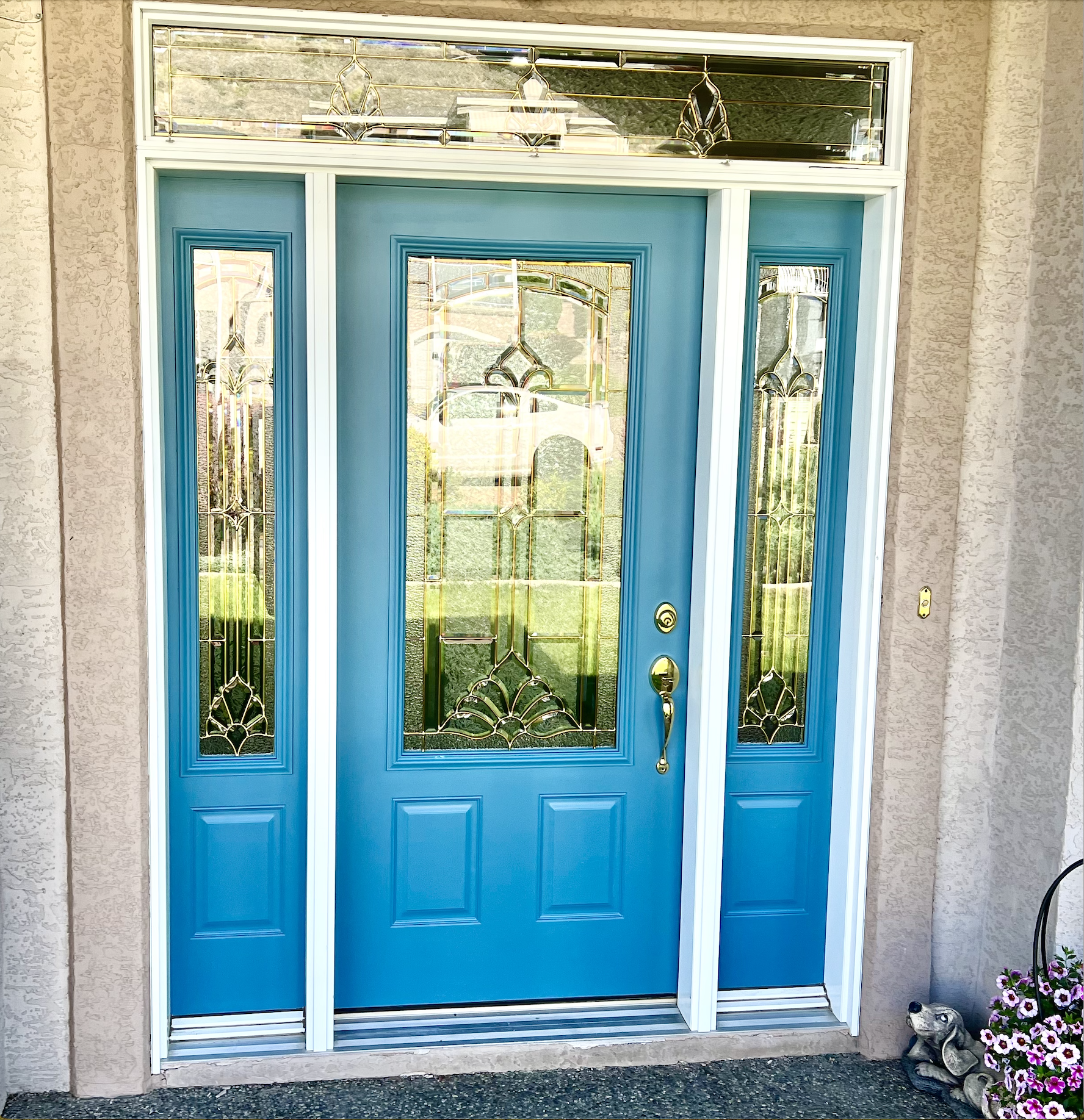 This customer struck a perfect balance between buying new and repainting the old to create a stunning home. Some primer and paint on all the kitchen and bathroom cabinets allowed for a recurring bold feature colour. Once we flattened the ceilings, added the new heavier mouldings, a few dozen pot lights and voila! The home had a whole new feel!